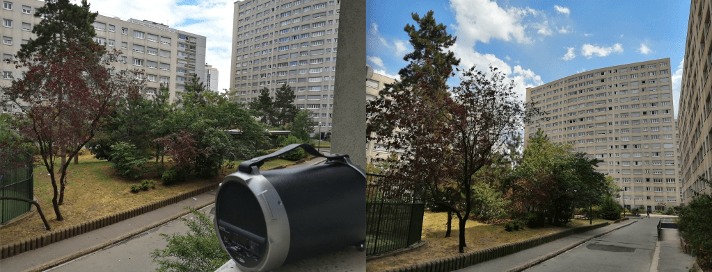 C’est une proposition basée en tout point sur le principe d’économie de moyens, par le choix du dispositif de diffusion comme par la sobriété de son contenu, et conçue pour résonner dans l’espace de cette cité dont les immeubles entourent une vaste dalle, au nord de laquelle se trouve un bosquet de conifères et d’arbustes feuillus, traversé par plusieurs familles d’oiseaux citadins: merles, moineaux, pigeons, corneilles etc.. Aux voix de ce peuple volatile se joignent celles de personnages invisibles, échappées des fenêtres alentours; le haut parleur s’immisce discrètement dans cette trame en pointillés